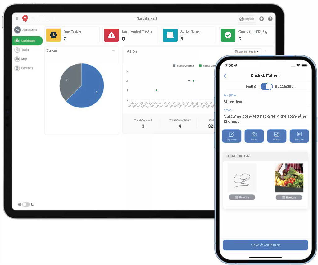 Drivers capture proof of delivery by adding signature, photos, notes, and barcodes to each delivery job which also logs the drivers GPS coordinates.
